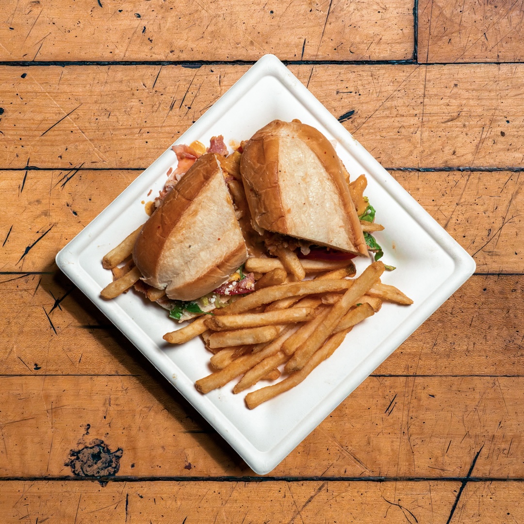 SANDWICH OF THE MOMENT: chopped chicken, applewood-smoked ham, french fries, lettuce, tomato, charred corn, garlic aioli, melted queso, cotija on a warm roll - served with your choice of house salad or fries