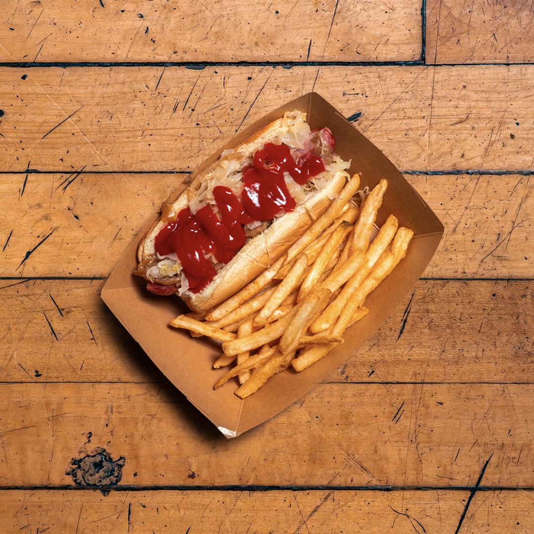 HOT DOG OF THE MONTH: hot dog, sauerkraut, mustard, onion sauce - served with your choice of house salad or fries